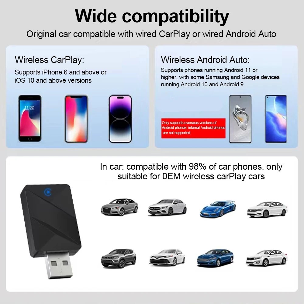 1: Confirm your vehicle is compatible before purchase: Before purchasing, please make sure the following: 1. Your vehicle was manufactured in 2016 or later and comes with factory-installed wired CarPlay or wired Android Auto. 2. Apple users: Your iPhone must be running iOS 10 or later, and your vehicle must support wired CarPlay. 3. Android users: Your phone must be running Android 11 or later, and your car must support wired Android Auto. 4. When using the adapter, please make sure your phone has Bluetooth (⚠️ For Samsung Galaxy series phones, if the connection fails, you can try restarting the phone several times.)