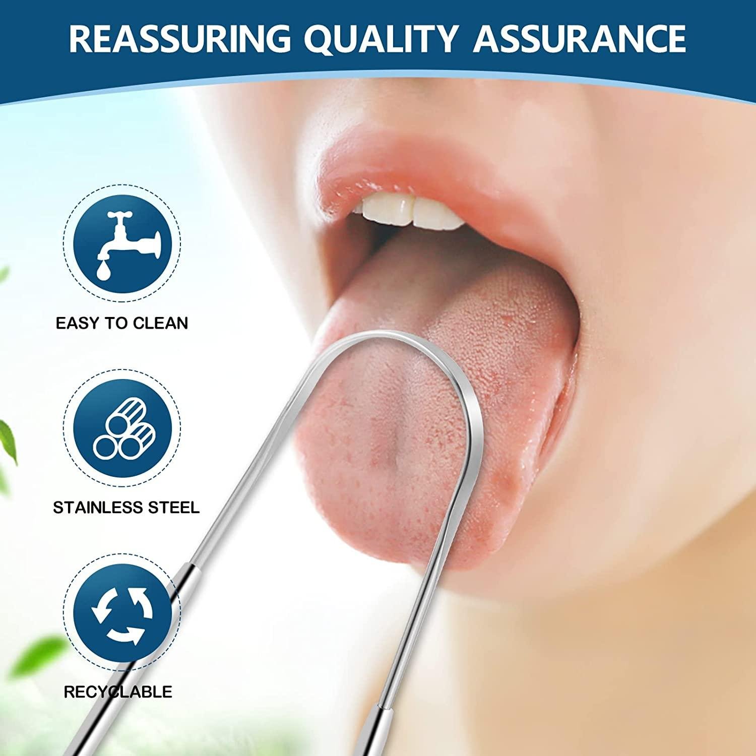 U-formad design: Den är U-formad och mycket lätt att använda, bara dra den över tungan för att ta bort plack för hälsoandning. Handtagen har greppskärningar så att greppet kan vara effektivt vid användning av tungskrapa.